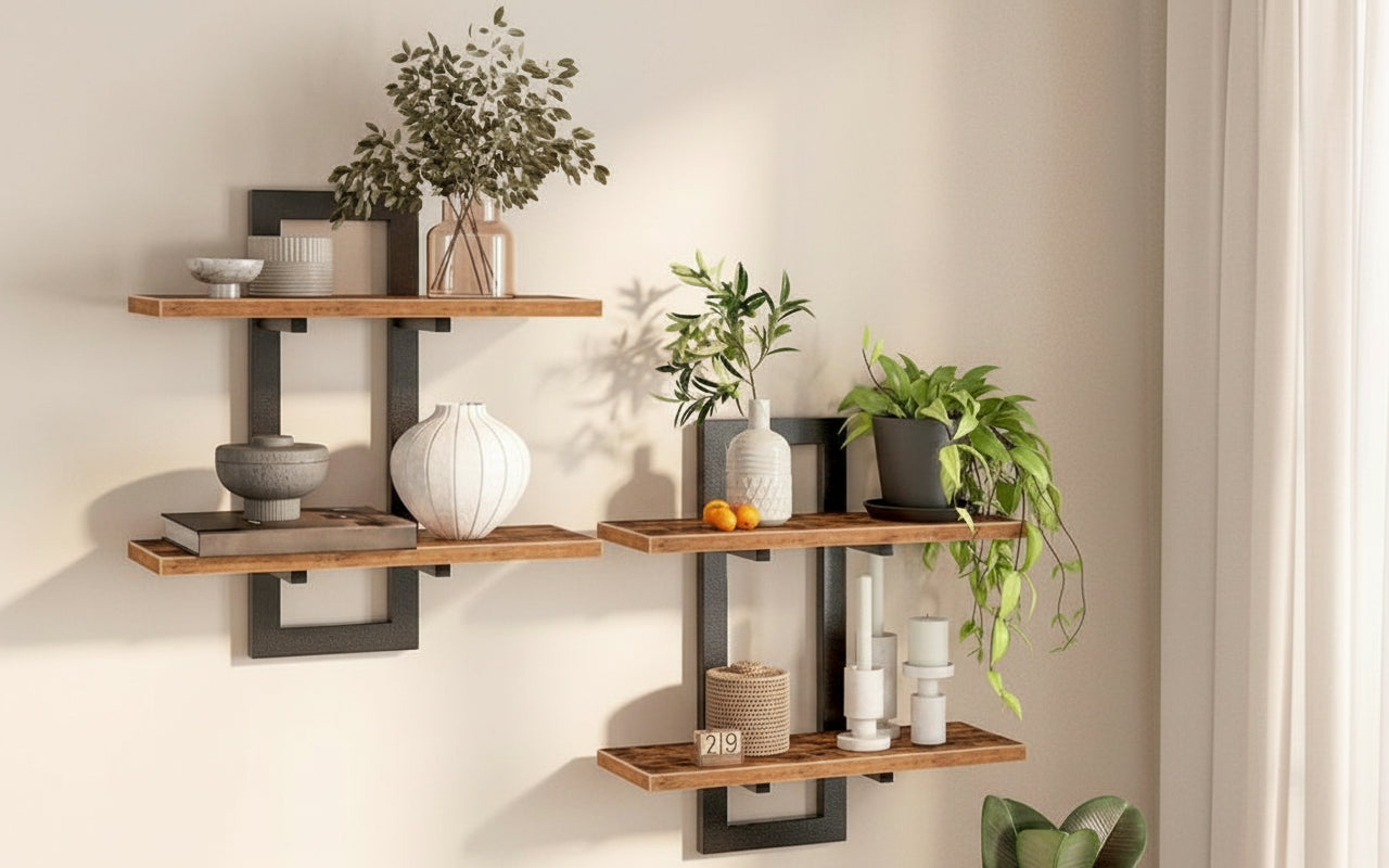 Kassar Modern Floating Wall Shelves Set, White with Gold Brackets, 3-Tier Decorative Display Storage (BB-New Iron-2 shelfs)